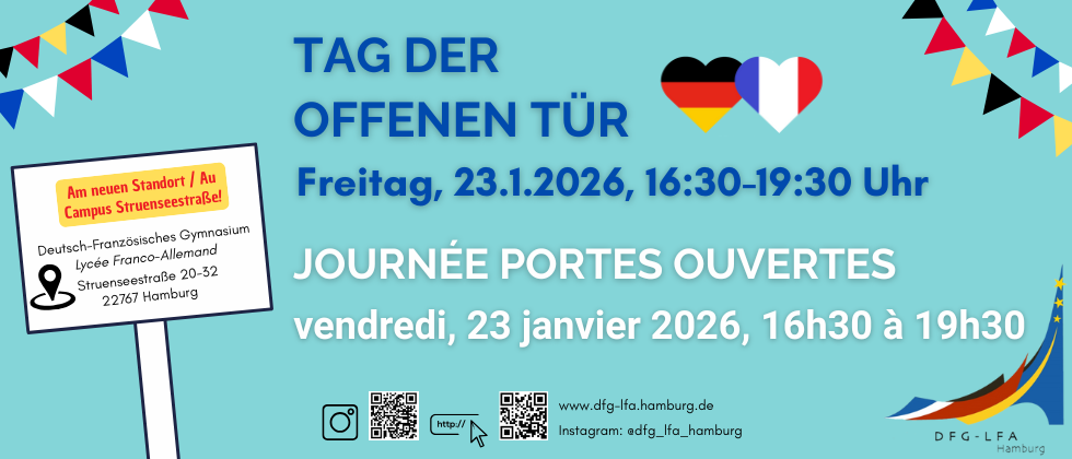- 1e 1ère 2nde 3e 3ème 4e 5. Klasse 5e 6. Klasse 6e 7. Klasse 9. Achte Altona Altona 2025 Ausflug Austausch Deutsch DFG DFG-LFA DFG TV Erasmus Filmfest Hamburg Filmwoche französisch Geschichte Hörspiel Interview Klassenfahrt Kunst Musik Neubau Preis Première Projekt Radio Planet Radio Planet Hamburg Sechste Sechste Klasse secondes Siebte Sport Tale Theater Wettbewerb