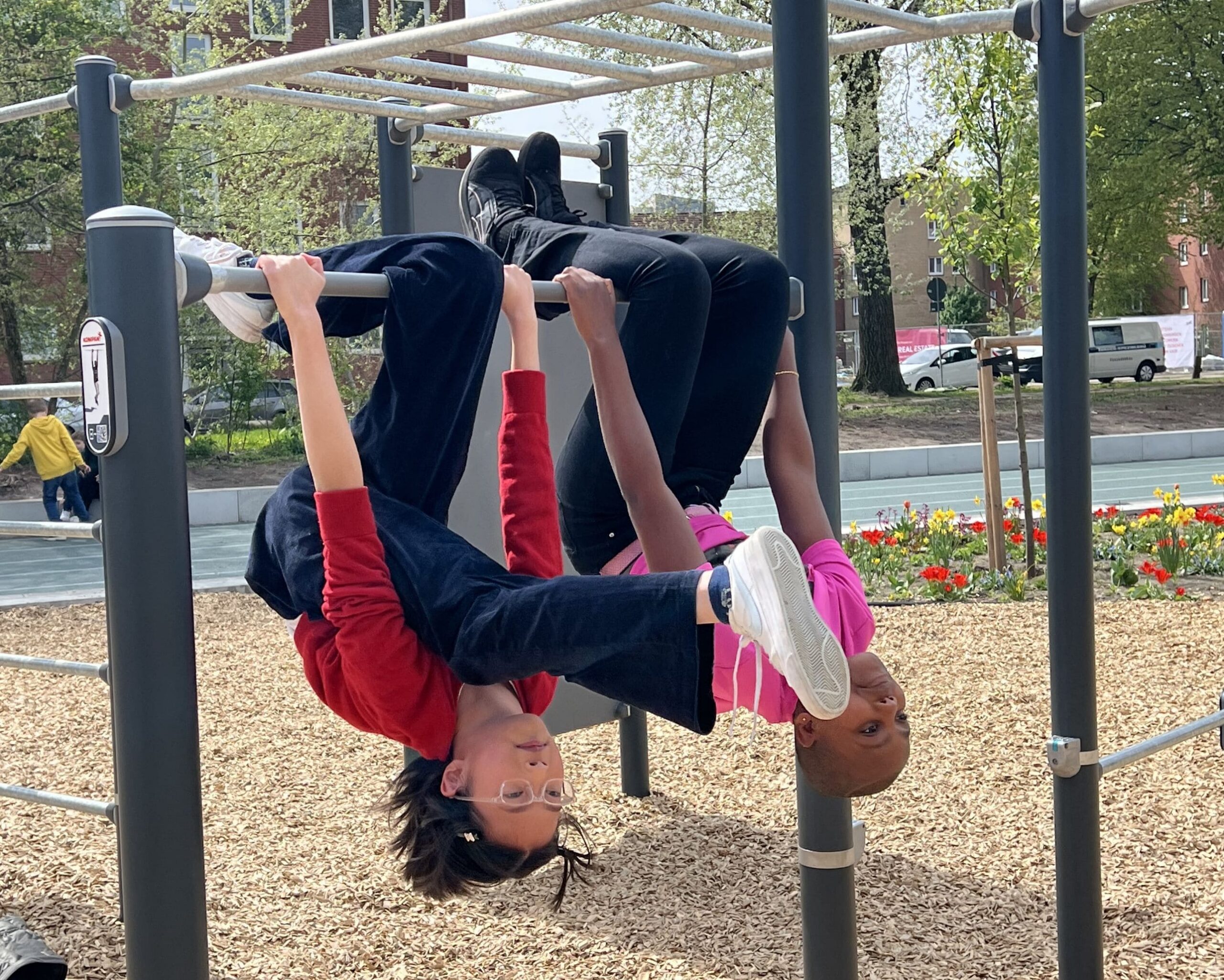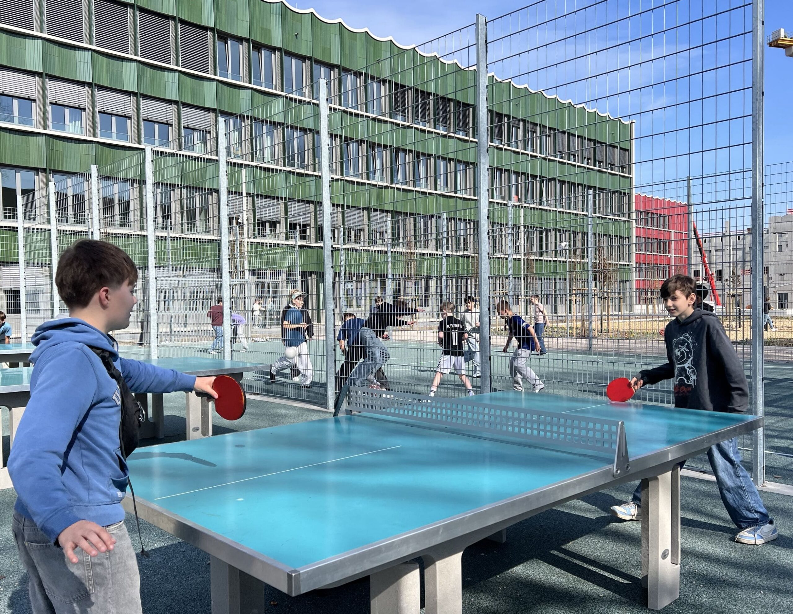 Située entre les parterres fleuris, la station de street workout est très appréciée des élèves : on y fait de la gymnastique, on s’y suspend et on y saute ! L’ambiance est tout aussi sportive sur les terrains de football et autour des tables de ping-pong, où l’on joue en double ou lors de parties rapides.