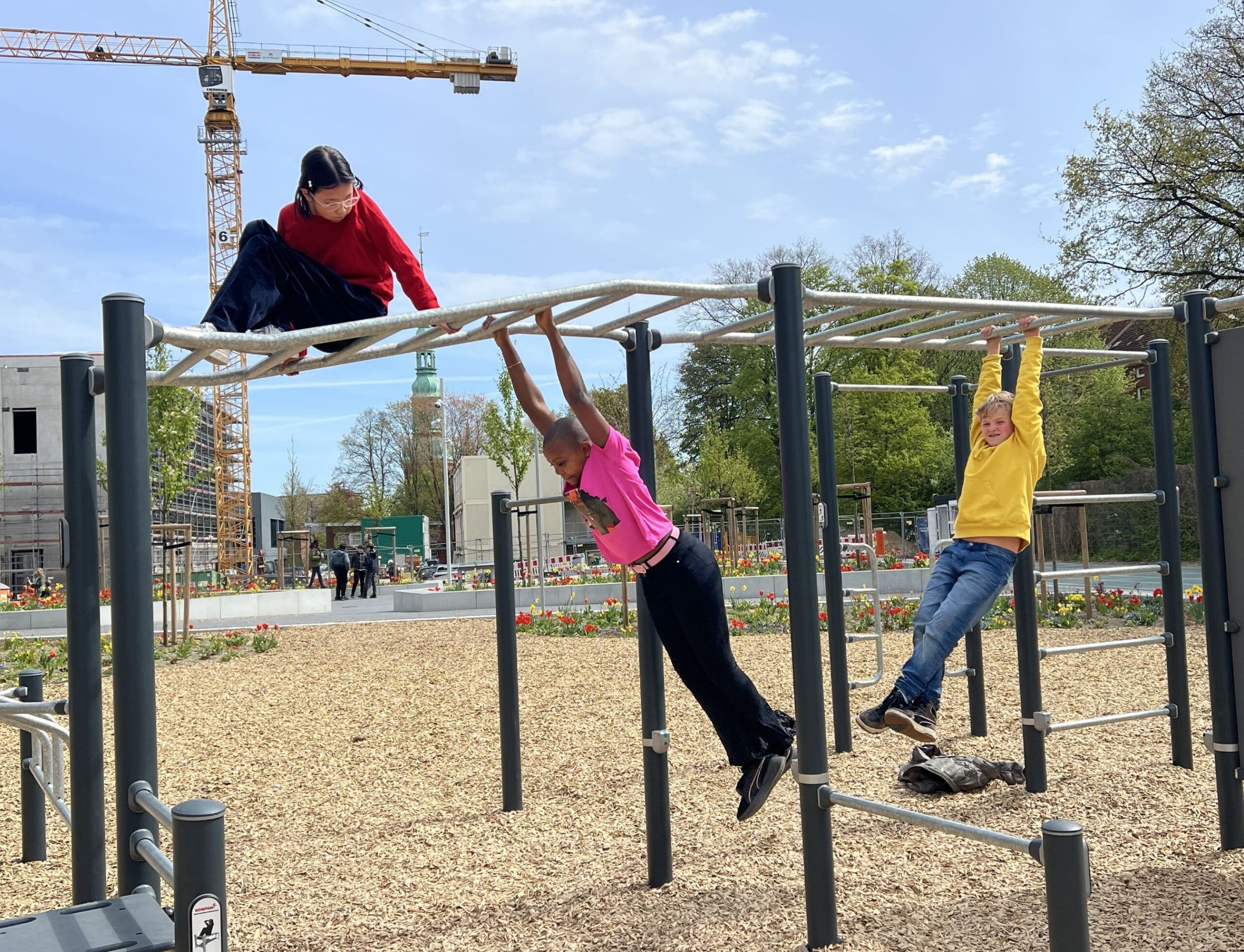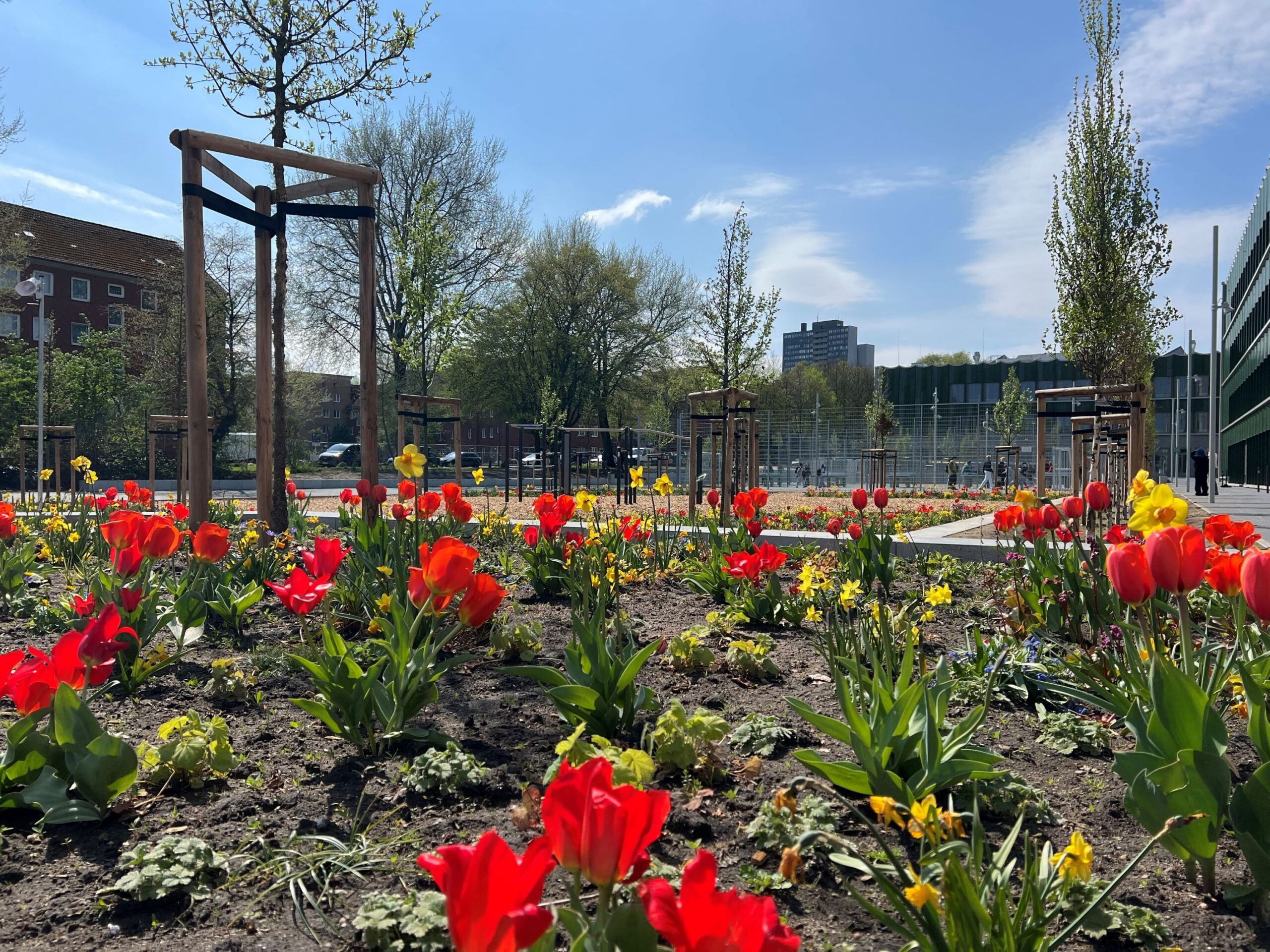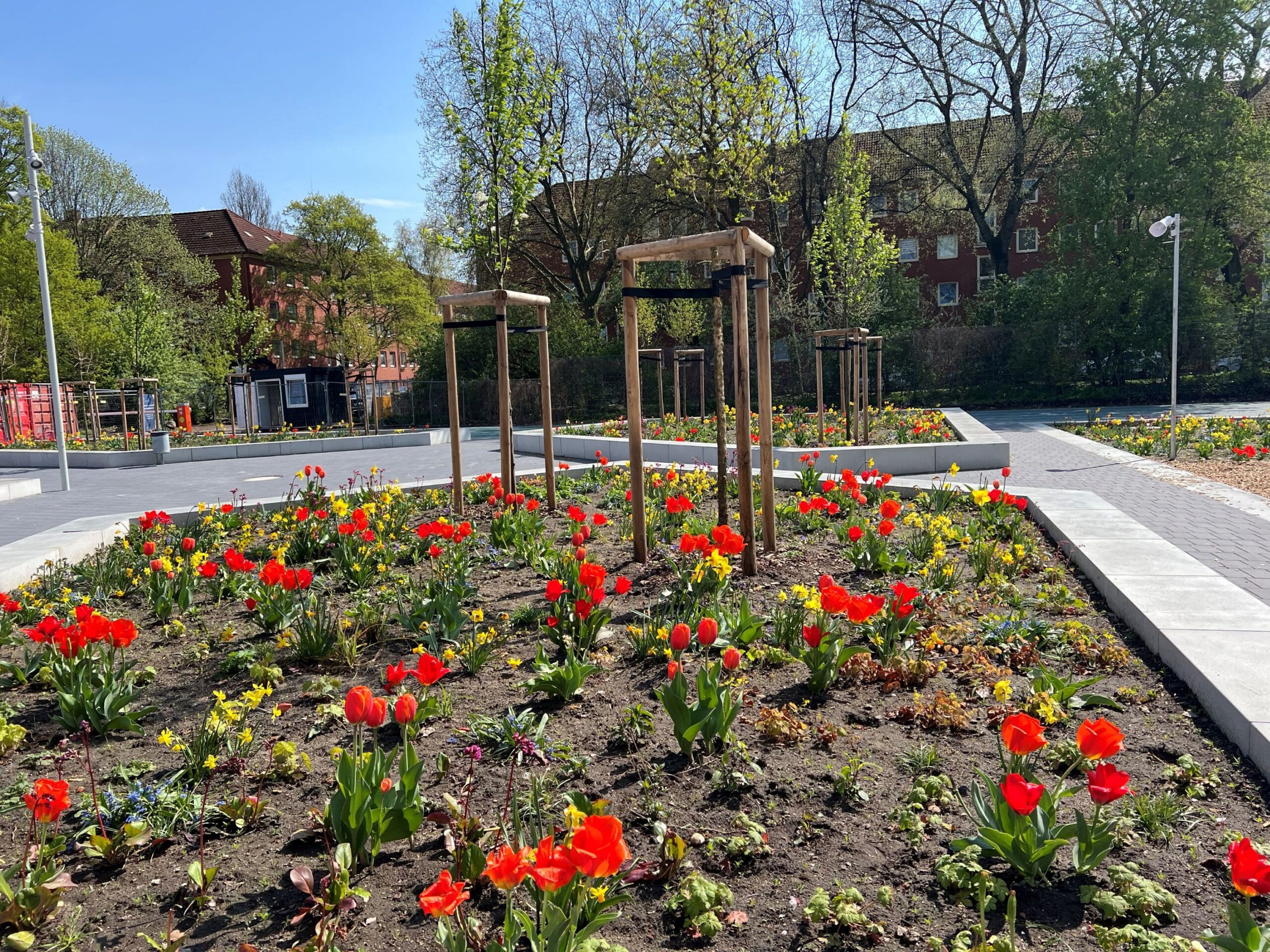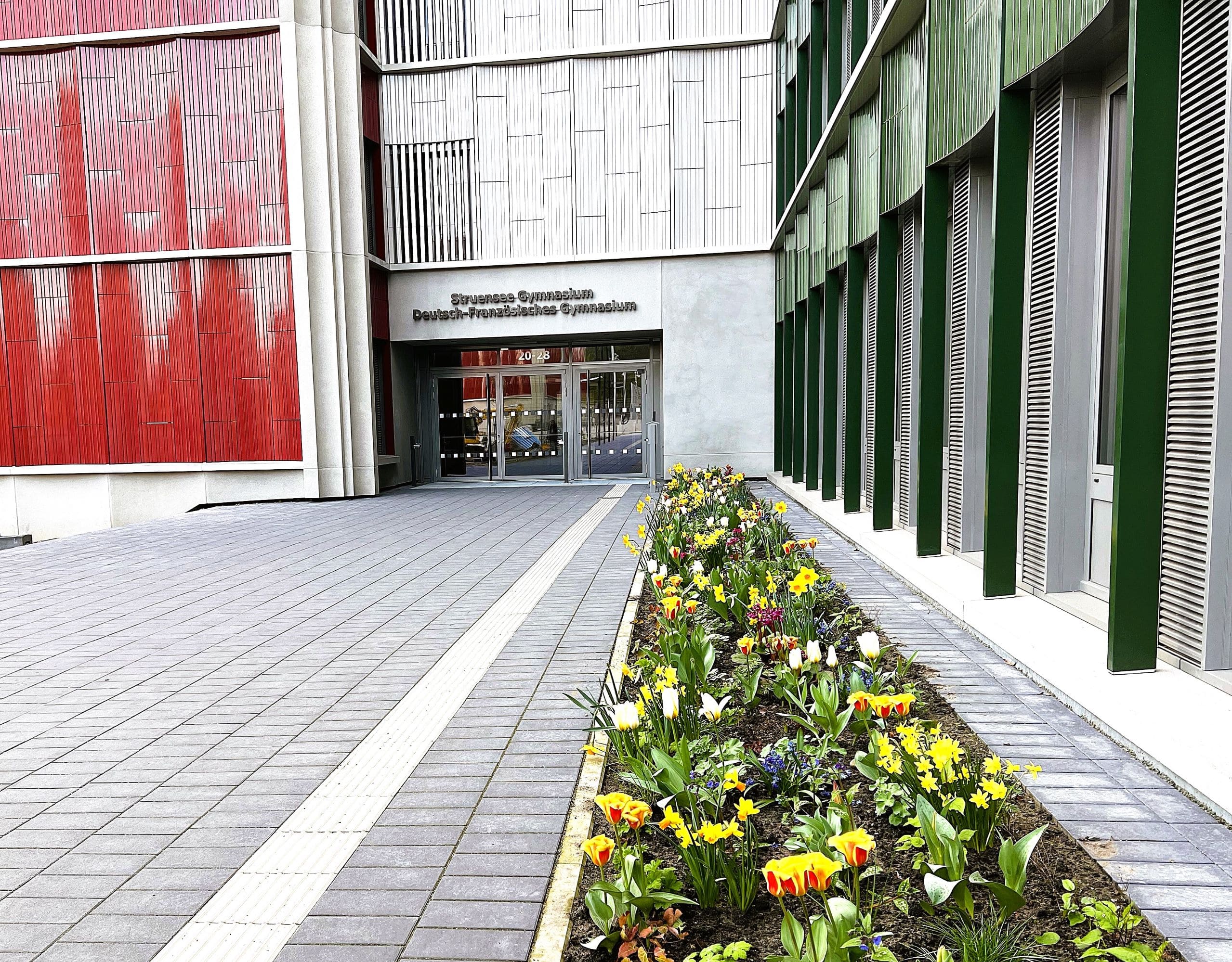 Les espaces verts de la cour de récréation commencent à s’épanouir. Les arbres ont bien pris racine et verdissent. Les parterres de fleurs se montrent actuellement dans toute leur splendeur. Le concept innovant semble porter ses fruits : les fleurs poussent à des rythmes différents, offrant une floraison en continue.