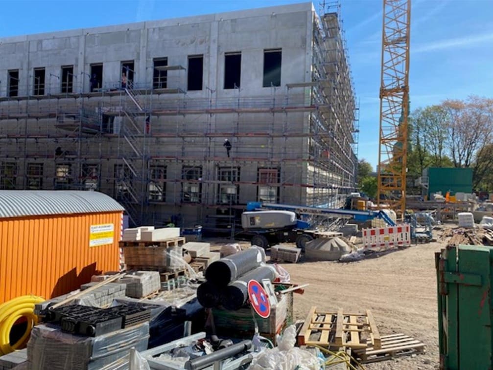 Après une longue période de gel générant un arrêt des travaux du gymnase, ceux-ci progressent désormais rapidement : le toit est étanche, la pose des fenêtres et de la façade est en cours. Au rez-de-chaussée, les travaux d’intérieur ont déjà commencé.